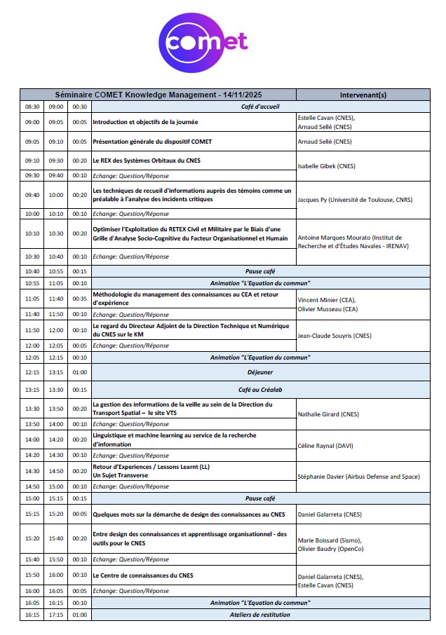Ajouter à votre agenda 14-11-2025 08:30 14-11-2025 17:15 <p>Nous sommes heureux de vous inviter au premier événement organisé par notre COMET Knowledge Management.</p><p>Il s’agira d’une <strong><u>rencontre entre représentants de l’écosystème&nbsp;KM</u></strong> où ceux-ci viendront présenter :&nbsp;</p><p>&nbsp;-&nbsp;&nbsp;&nbsp;&nbsp;&nbsp;&nbsp;&nbsp;&nbsp;&nbsp; Leur organisation de la gestion des connaissances</p><p>-&nbsp;&nbsp;&nbsp;&nbsp;&nbsp;&nbsp;&nbsp;&nbsp;&nbsp; Des exemples de dispositifs ou de projets de gestion de connaissances mis en œuvre</p><p>-&nbsp;&nbsp;&nbsp;&nbsp;&nbsp;&nbsp;&nbsp;&nbsp;&nbsp; Des synergies avec d’autres activités transverses dans l’entreprise (formation, qualité, sécurité, documentation, innovation …)</p><p>En bref, nous invitons des acteurs du KM (dont le CNES) à présenter leurs activités ou un sujet de leur choix autour de la gestion des connaissances afin d’amorcer de premiers échanges pour construire cette communauté d’expertise COMET.</p><p>L’événement se déroulera sur le site du CNES, au Créalab (Bâtiment D'Alembert) et en visioconférence pour les participants à distance.</p><p><u>La gestion des connaissances est l’affaire de tous&nbsp;! Nous espérons vous retrouver nombreux lors de cette journée.</u></p><p><strong>Programme :</strong></p><img src="/sites/default/files/inline-images/Programme_3.jpg" data-entity-uuid="0ea9cf20-55e1-4786-a959-c0cdf0ade607" data-entity-type="file" width="636" height="906"><p>&nbsp;</p> CNES - Centre Spatial de Toulouse, TOULOUSE, France